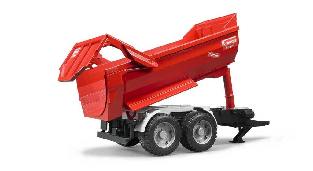 La fiel réplica de plástico del remolque agrícola KRAMPE ofrece a los niños un juego de granja auténtico. Gracias a la caja basculante funcional con apertura automática de la pared trasera, cargar y descargar es fácil y divertido. El modelo está realizado con gran precisión hasta en los detalles más pequeños y se conecta sin problemas a los tractores BRUDER.
