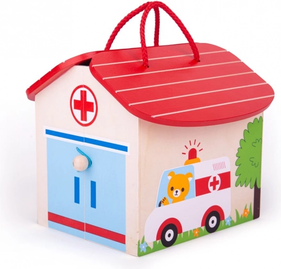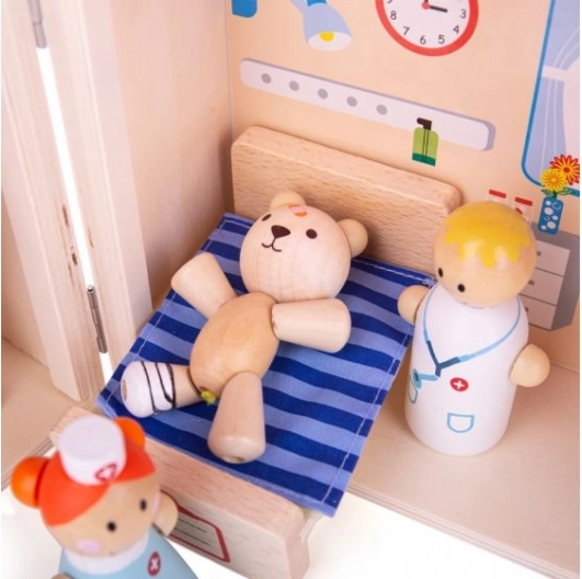 Este set de juego Hospital del Osito, compacto y portátil, es ideal para pequeños doctores. La estructura de madera es resistente y fabricada con materiales de alta calidad que cumplen todas las normas europeas de seguridad. El juguete incluye nueve piezas de juego que permiten a los niños crear diversos escenarios y situaciones.