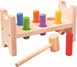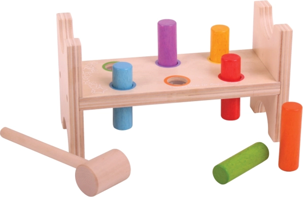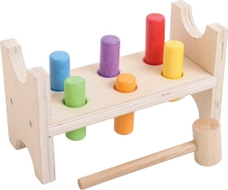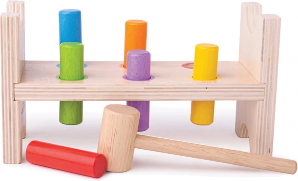 Un banco de golpeo de madera divertido y seguro para los más pequeños que desarrolla la coordinación mano-ojo y la motricidad fina. Gracias a los pasadores de colores y al robusto martillo de madera, los niños entrenan la precisión y la fuerza de agarre. El juguete tiene bordes redondeados, está hecho de madera de alta calidad y cumple con las normas europeas de seguridad.