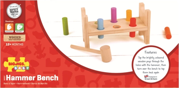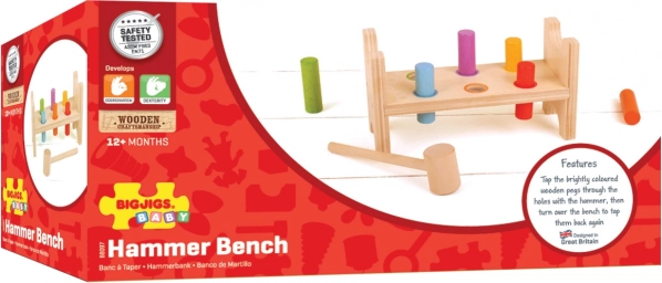 Este clásico banco de golpeo de madera de la marca Bigjigs Baby entusiasma a los niños con su sencillo principio: los pasadores se golpean con el martillo dentro de los orificios, luego basta con girar el banco y la diversión puede empezar de nuevo. Los colores vivos estimulan la percepción y favorecen la concentración.