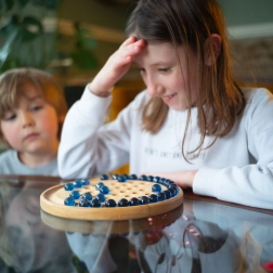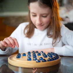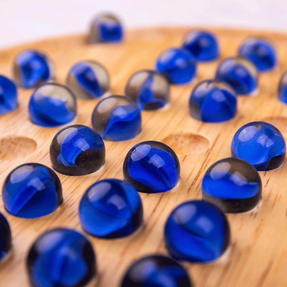 El tablero circular de madera lisa y las brillantes canicas de vidrio garantizan una agradable sensación de juego y una larga durabilidad.