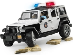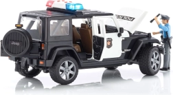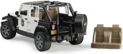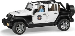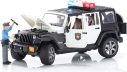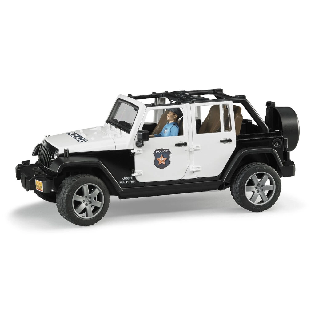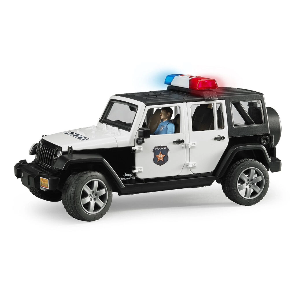 Modelo realista BRUDER Jeep Wrangler Rubicon en versión policial que ofrece a los niños una diversión de primera y un acabado detallado. Incluye puertas, capó y luneta trasera abatibles, ejes con suspensión, techo desmontable en dos piezas y dirección mediante volante adicional. Contiene una figura de policía con amplio equipamiento y un farBeacon funcional con 4 sonidos para un juego aún más realista.