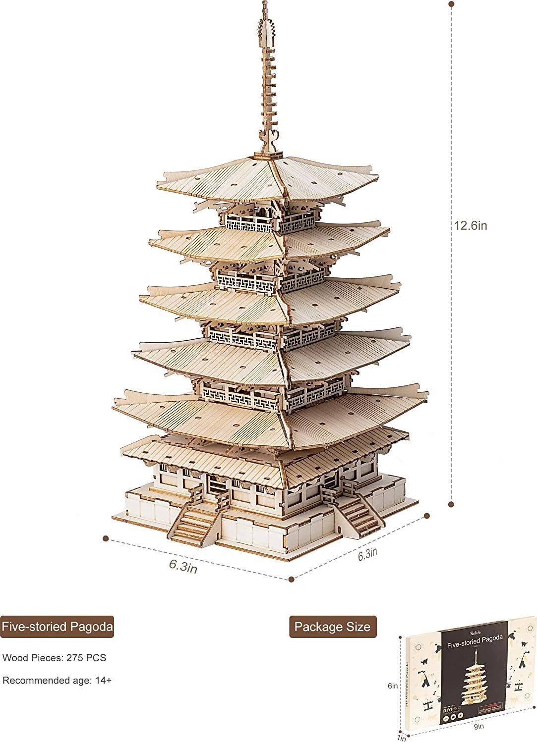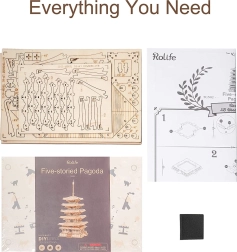 Este modelo de la serie ROBOTIME ROLIFE Do It Yourself te permite crear tu propia pagoda 3D de madera. Sus piezas cortadas con láser de contrachapado son un placer para trabajar, y todo está hecho con materiales seguros y no tóxicos. Este modelo pone a prueba tu destreza técnica e imaginación, mientras desarrolla tu atención al detalle y la motricidad fina.