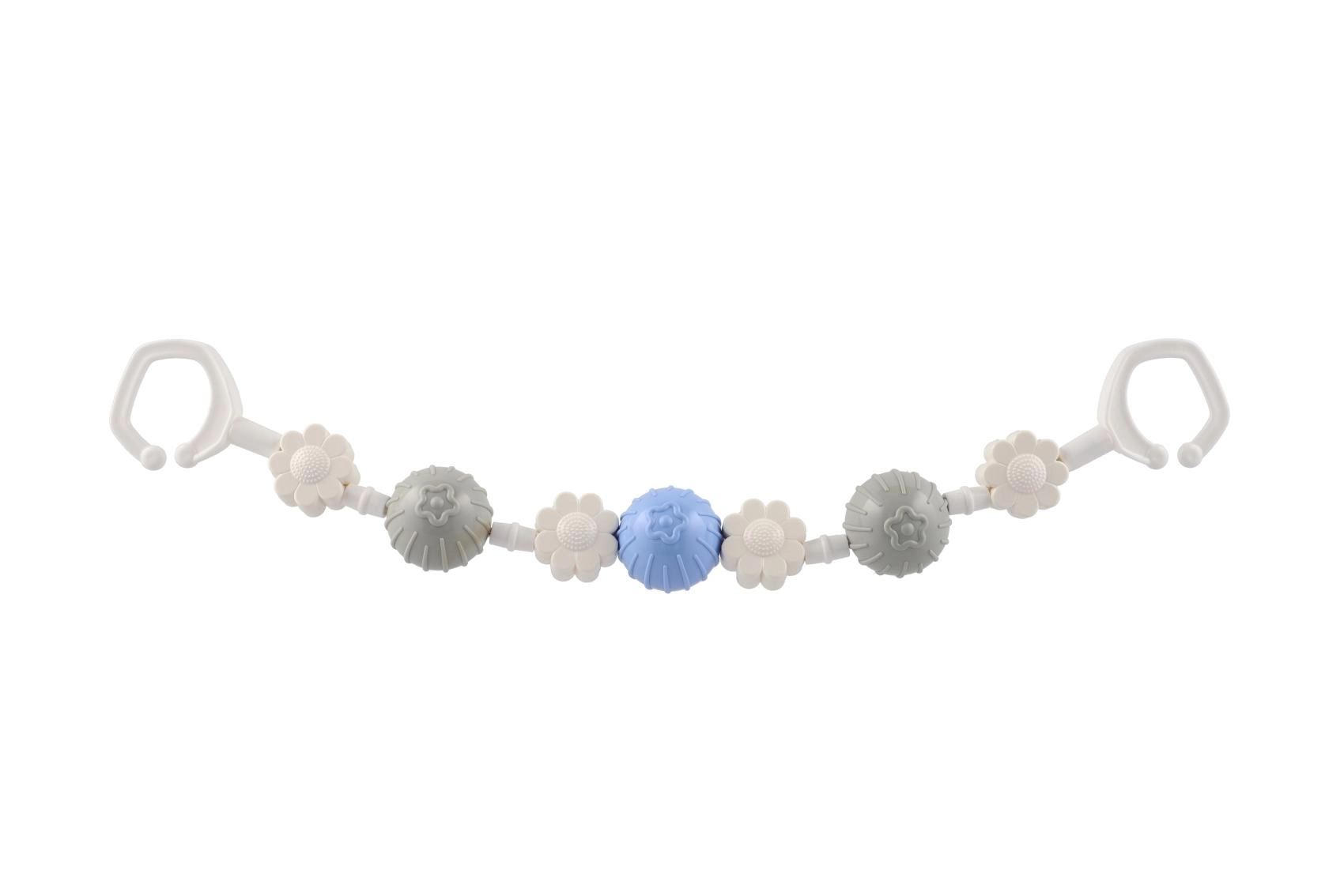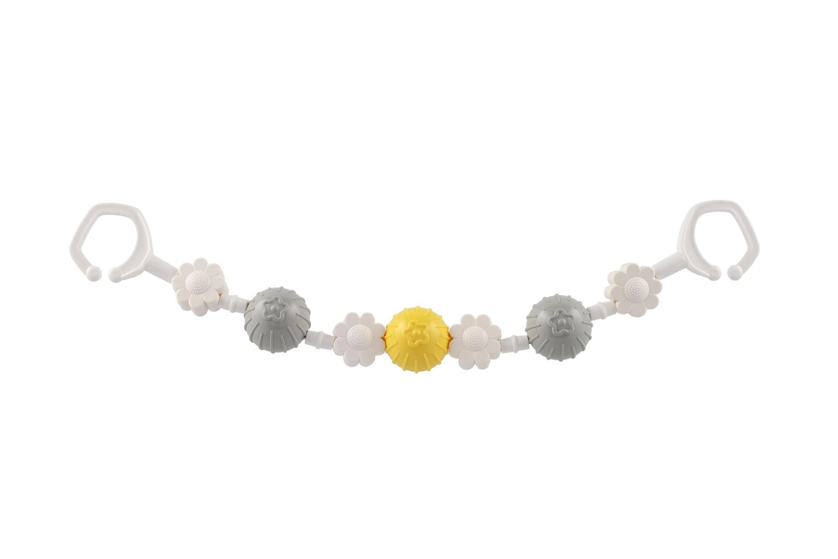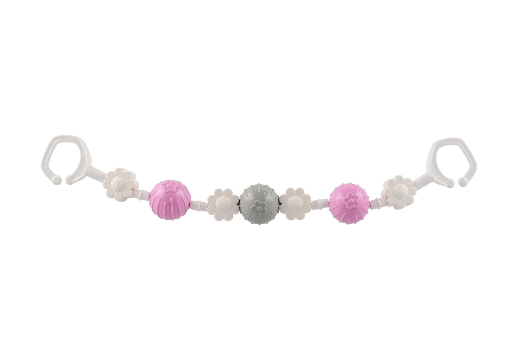Las flores y bolitas alternas con diferentes texturas estimulan el tacto, la vista y la concentración, motivando al bebé a agarrar y girar.
