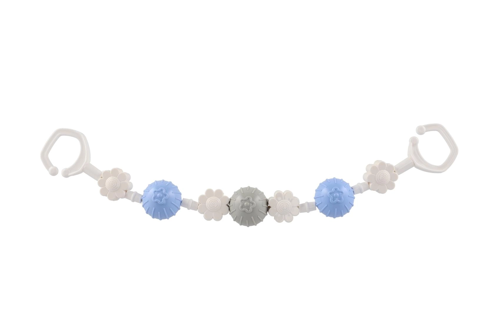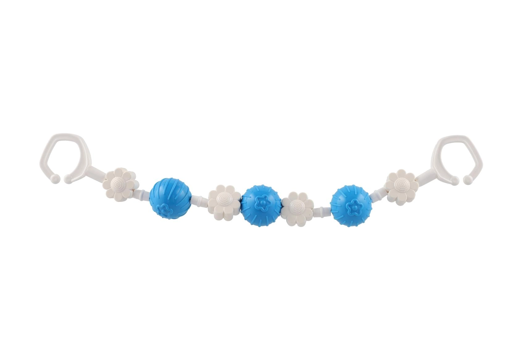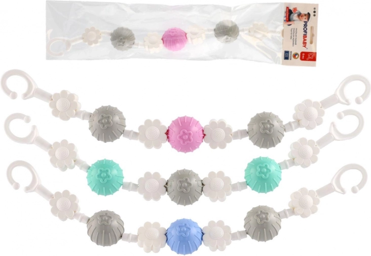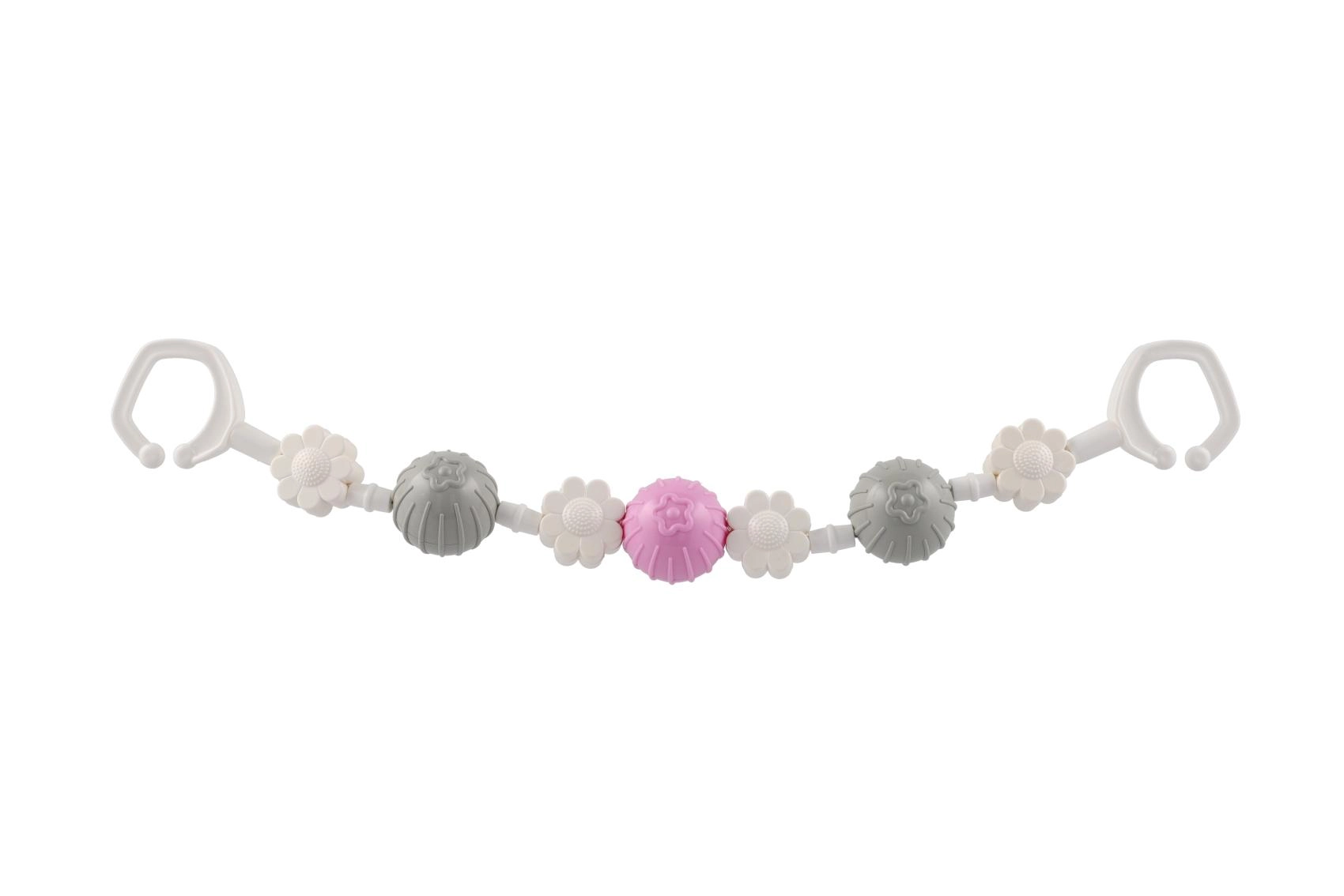Las flores y bolitas alternas con diferentes texturas estimulan el tacto, la vista y la concentración, motivando al bebé a agarrar y girar.