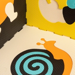 La alfombra está fabricada con espuma EVA de calidad, es antideslizante, impermeable y muy fácil de mantener: basta con pasar un paño húmedo. Con las piezas también se pueden crear estructuras 3D como una pequeña casita o un corralito para delimitar una zona de juego segura.
