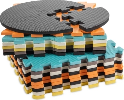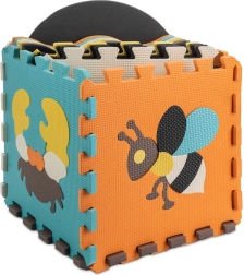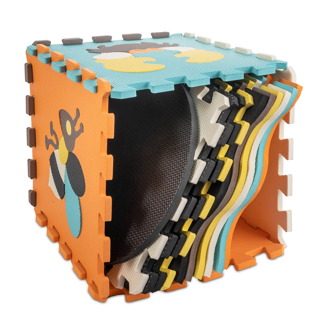 La alfombra se monta fácilmente en una superficie de 114 × 114 cm o, con las piezas, puedes crear un corralito bajo de 90 × 90 × 16 cm. Las formas extraíbles funcionan como clasificador: los niños las insertan de nuevo en las aberturas correctas y entrenan la motricidad fina, la lógica y la creatividad. Las piezas son impermeables y fáciles de limpiar con un paño húmedo, por lo que son adecuadas para el dormitorio infantil y la sala de juegos.