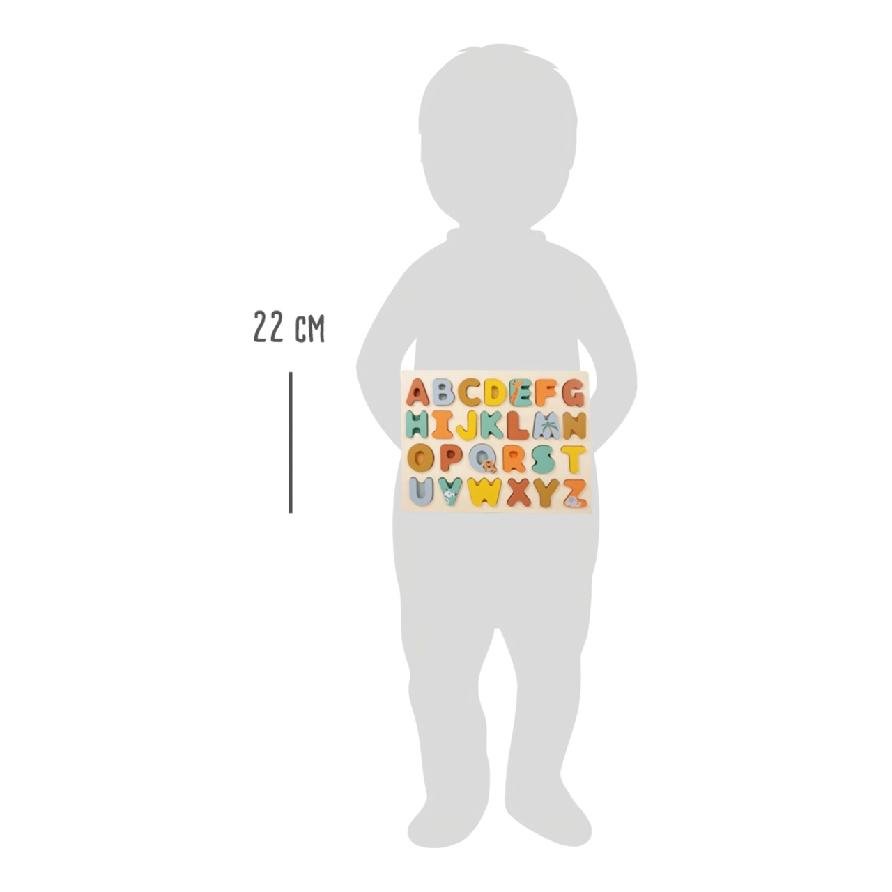 Este rompecabezas de madera de alta calidad en modernos colores pastel ofrece 26 letras en relieve que los niños pueden agarrar fácilmente, colocar en el hueco correcto y aprender así el abecedario de forma natural y lúdica. Los encantadores motivos de safari —cebra, jirafa, elefante y tigre— motivan a explorar y divertirse cada día.