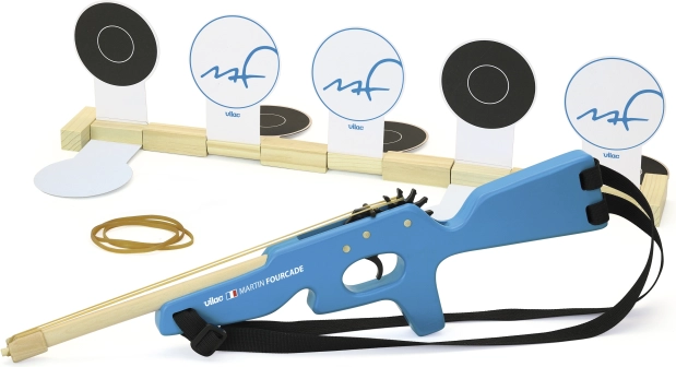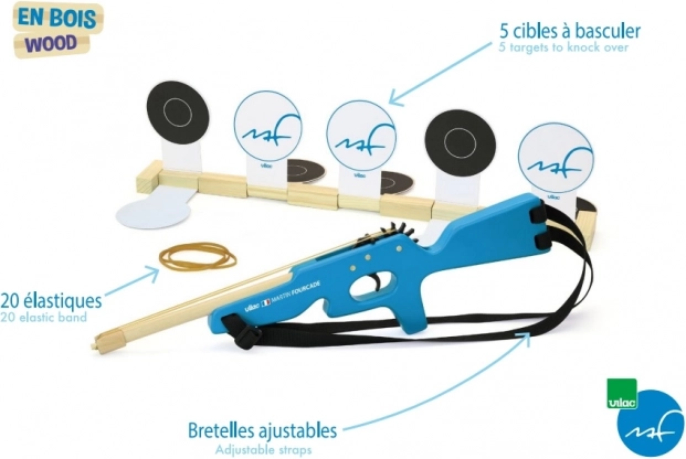 La rifle de madera está equipada con correas textiles ajustables, ideales para cada niño. El paquete incluye cinco dianas abatibles y veinte gomas para disparos repetidos. ¡Prueba a colocar las dianas a distintas distancias y pon a prueba tu puntería!