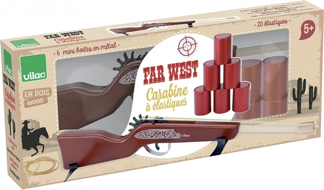 ¡Bienvenido al Lejano Oeste! La rifle de madera con gomas de VILAC ofrece diversión segura e ingeniosa para pequeños tiradores. Gracias a su aspecto realista con motivos decorativos y construcción ligera, los niños disfrutarán horas de juego de precisión, ya sea solos o compitiendo con amigos.