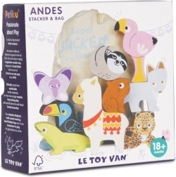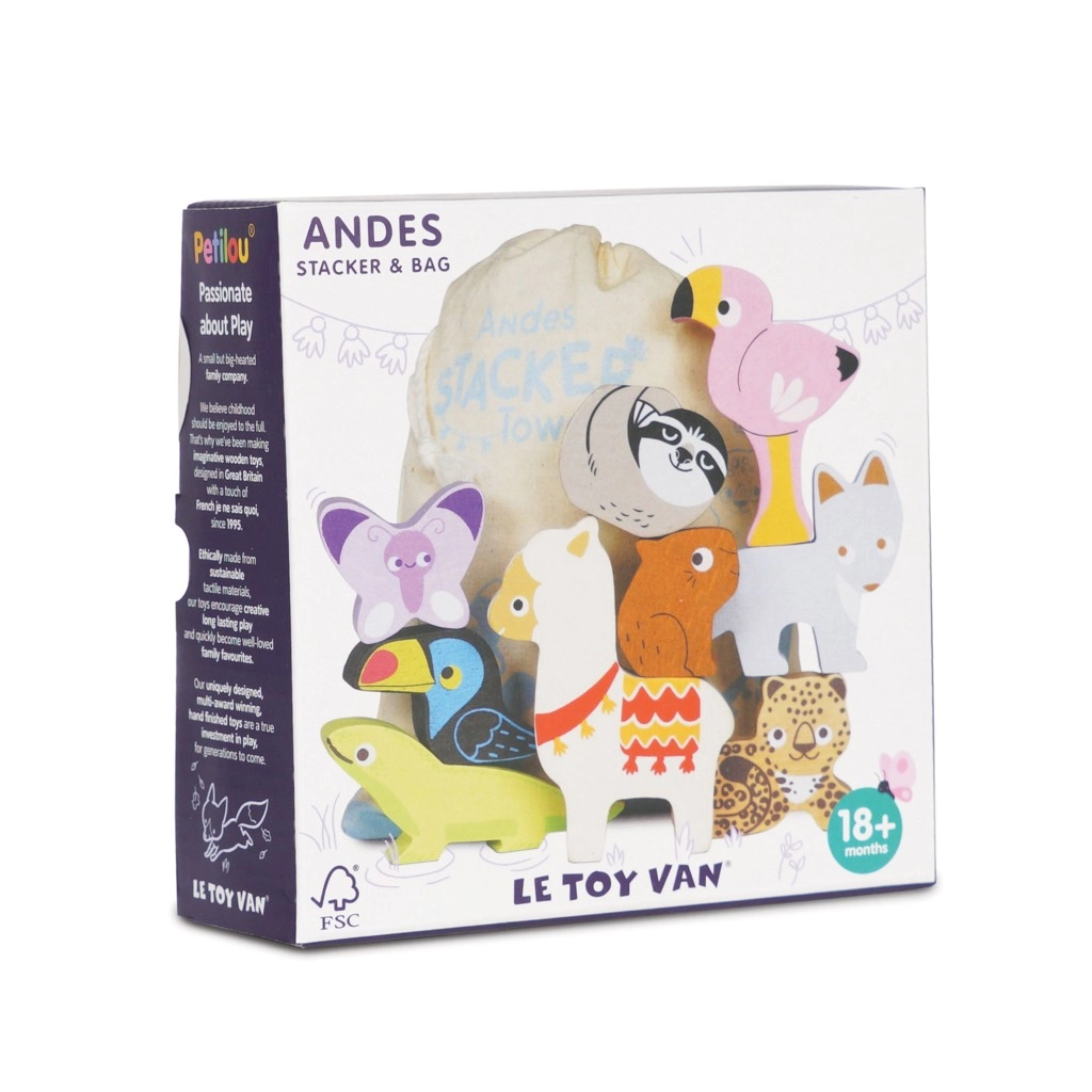 Esta torre apilable andina lleva la aventura de la montaña directamente a la habitación infantil. El set incluye robustas figuras de animales de madera (p. ej., llama, flamenco, tucán, lagartija, mariposa, perezoso) y una pieza de montaña, que pueden apilarse, equilibrarse y combinarse en divertidas composiciones.
