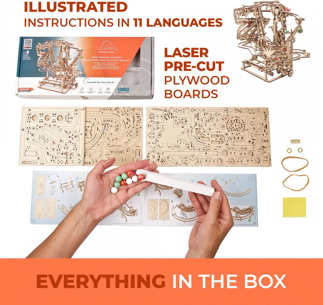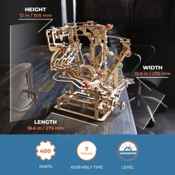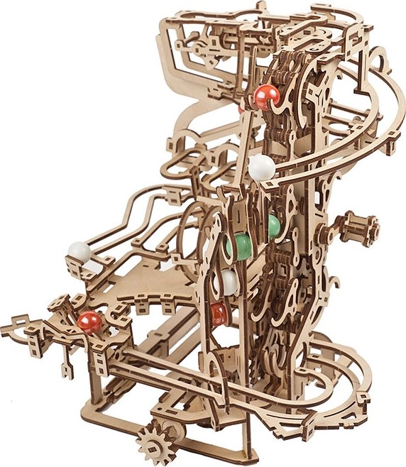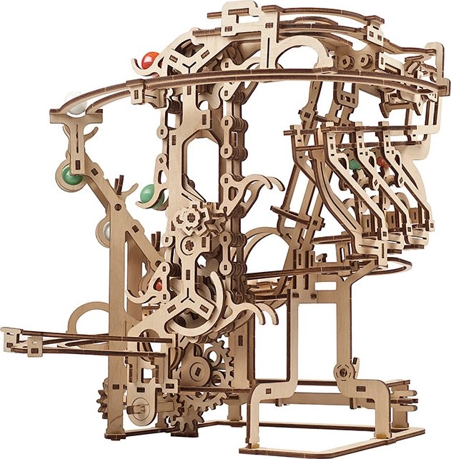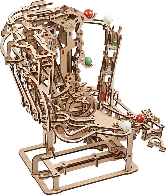 Esta elaborada pista de canicas de contrachapado de alta calidad ofrece una combinación de disfrute modelista, valor educativo y un espectáculo relajante. El elevador de cadena accionado manualmente transporta con fluidez las canicas al inicio, desde donde se lanzan por tres secciones independientes, cada una con un obstáculo principal único. El diseño abierto resalta la mecánica funcional y los detalles finos.