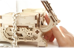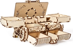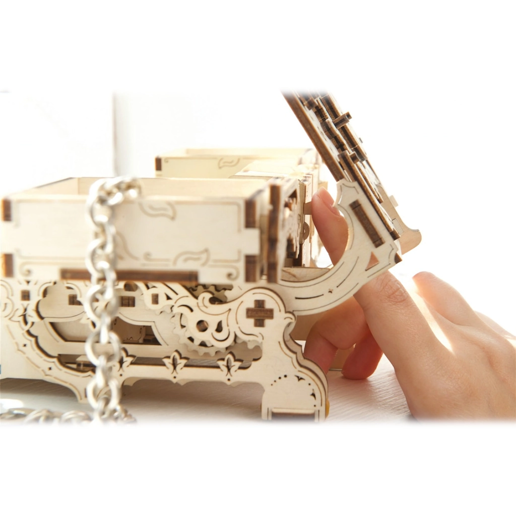 El modelo complacerá tanto a principiantes como a constructores avanzados a partir de 14 años. Con el mantenimiento adecuado (ligero engrase con cera según las instrucciones), el mecanismo funciona de forma suave y duradera. Cerrada, la caja presenta dimensiones compactas; al abrirse, se transforma en un llamativo organizador con varios niveles de almacenamiento.