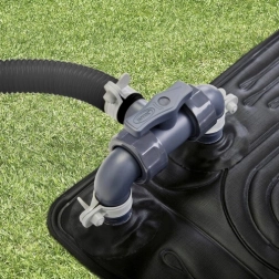 Gracias a la posibilidad de conectar varias alfombras podrás adaptar el calentamiento al volumen de tu piscina. La válvula bypass integrada permite regular el caudal o excluir temporalmente la alfombra del circuito. La alfombra admite mangueras de Ø 32 mm y, mediante los adaptadores incluidos, también de Ø 38 mm. Para el mejor rendimiento, utiliza una bomba de filtración con caudal de 2006–5678 l/h.