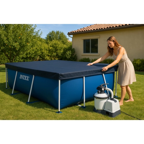 La cubierta INTEX está diseñada para piscinas rectangulares con estructura de 300 × 200 cm. Gracias a su material resistente, soporta las inclemencias del tiempo y ayuda a proteger el agua de hojas, insectos y suciedad. El solape de aprox. 20 cm y el cordón de fijación garantizan una sujeción estable para que la cubierta no se desplace.