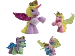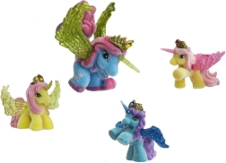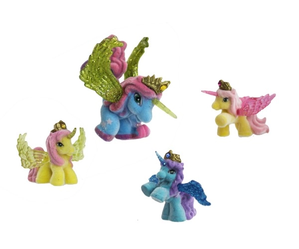 Cada caballito tiene alas con brillo, un cuerno mágico y una corona dorada con una “gema” de color: ideal para juegos de fantasía.