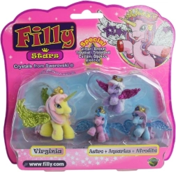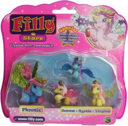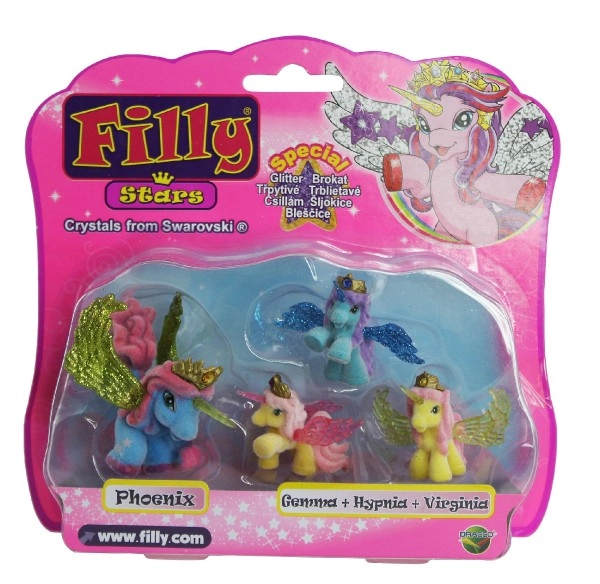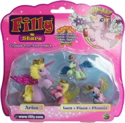 Filly Stars aporta una dosis de fantasía a cualquier habitación infantil. El set 1+3 incluye un caballito más grande y tres potrillos en colores vivos. Gracias a las alas brillantes, las coronas doradas y los cuernos mágicos, los niños se enamorarán de los cuentos de hadas y del juego creativo.