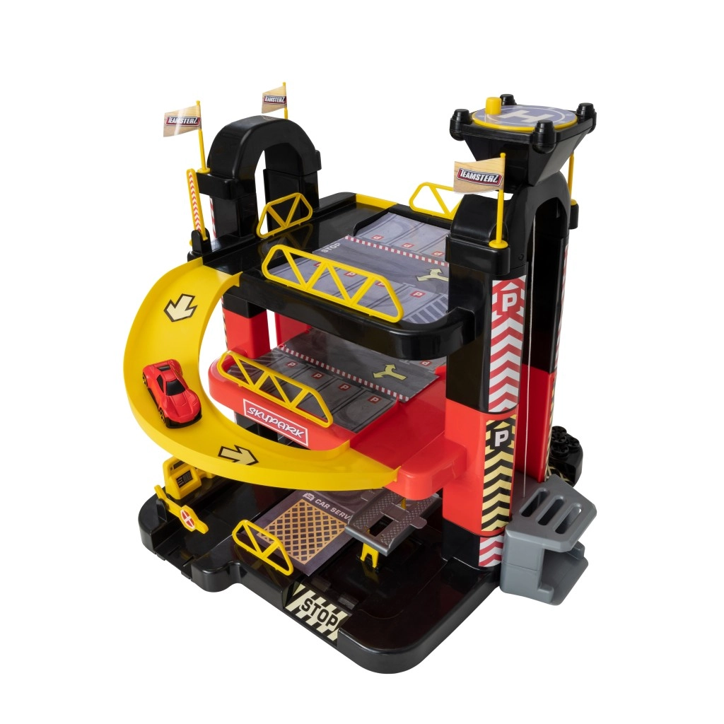 La estructura de tres niveles imita un aparcamiento real, incluyendo señales y flechas direccionales para una experiencia más auténtica.