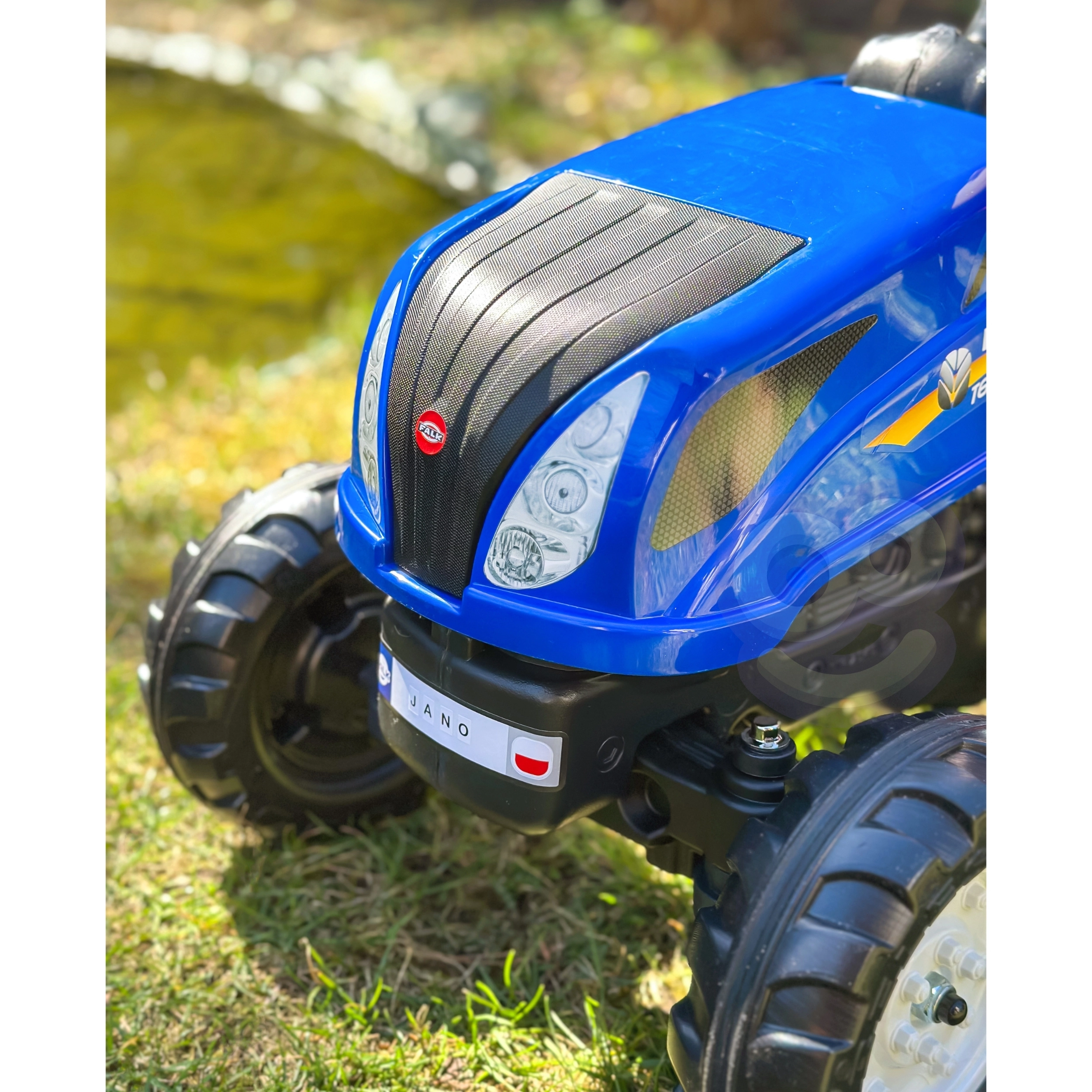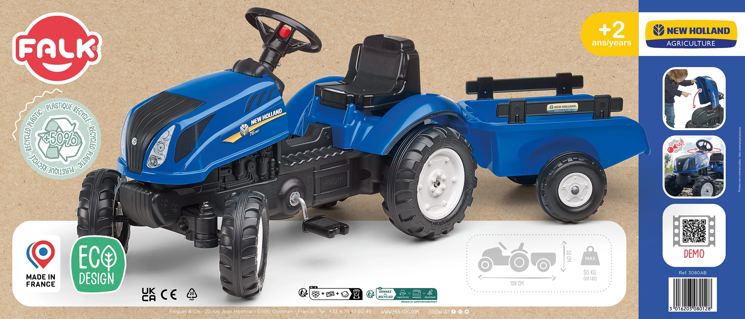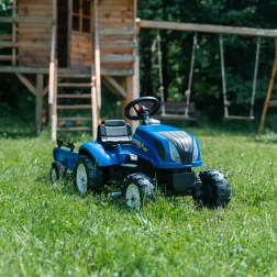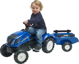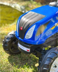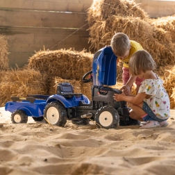 El tractor de pedales inspirado en las máquinas reales NEW HOLLAND brinda a los niños una experiencia de conducción realista. Gracias al capó abatible con imitación de motor, los pequeños conductores pueden explorar las “entrañas” de la máquina, mientras que la transmisión por cadena en el eje trasero asegura una conducción suave. El remolque desmontable es ideal para transportar juguetes o pequeñas cargas en el jardín.