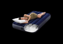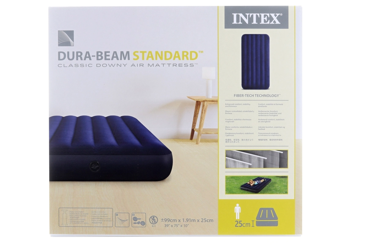 Práctico colchón inflable para una persona con dimensiones de 191 × 99 × 25 cm de la marca INTEX, ideal para uso en casa y viajes. El PVC resistente con terciopelo aterciopelado en la superficie garantiza un tacto agradable y mejor agarre de la sábana, mientras que la tecnología Dura‑Beam Fiber ofrece un soporte estable y una larga vida útil. Incluye parche de reparación.