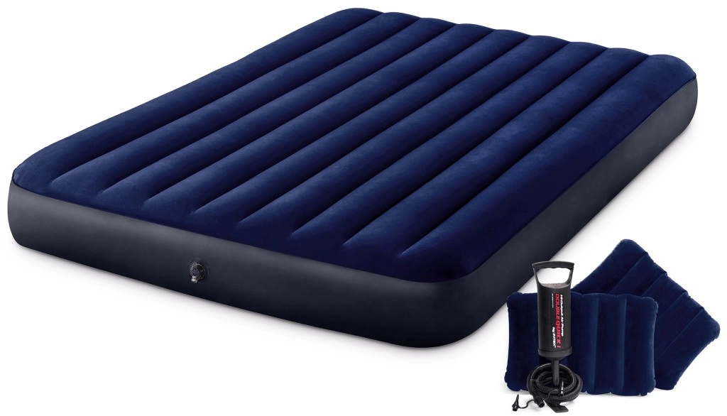Práctico colchón inflable INTEX para dos personas con dimensiones de 203 × 152 × 25 cm, superficie de terciopelo suave y construcción estable para un sueño cómodo en casa y de viaje. En el paquete encontrarás una bomba de mano de pistón, 2 almohadas inflables y un parche de reparación. Gracias a la válvula Boston, el inflado y desinflado es rápido y sencillo.
