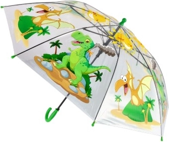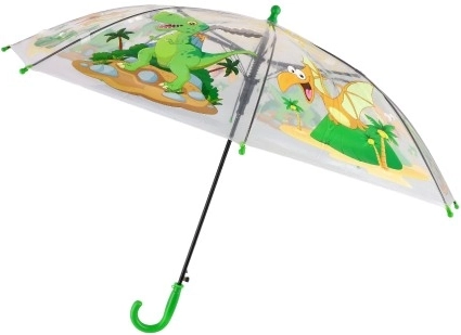 Un alegre paraguas infantil con cúpula transparente y coloridos motivos de dinosaurios convierte los días lluviosos en diversión. Gracias a su apertura automática, estructura ligera y cómoda empuñadura verde, se utiliza con facilidad y se adapta perfectamente a la mano de los niños.