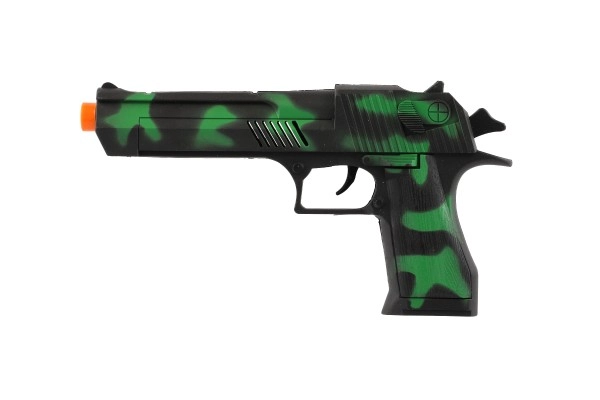 Un juguete divertido y seguro para pequeños aventureros: pistola de plástico con volante de inercia de 23 cm de longitud. Al apretar el gatillo emite efectos de sonido realistas sin necesidad de proyectiles, por lo que es segura para niños e ideal para jugar a policías y ladrones a partir de 3 años.