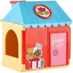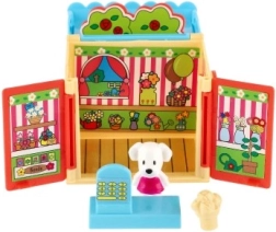 Una casita alegre con motivos florales y una caja registradora que enseña a los niños a combinar colores, arreglar y atender a los clientes.