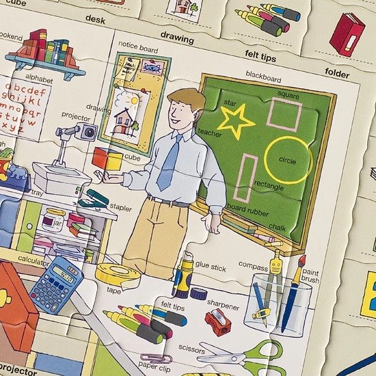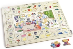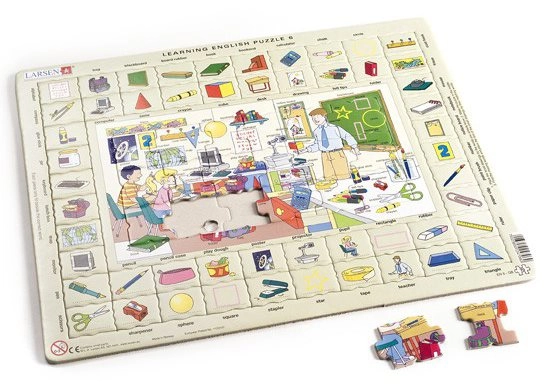 El rompecabezas Larsen es una excelente manera de motivar a los niños a estudiar inglés. Cada puzzle incluye escenas clásicas de 18 piezas, complementadas con piezas con imágenes que corresponden a los nombres en inglés en el borde.
