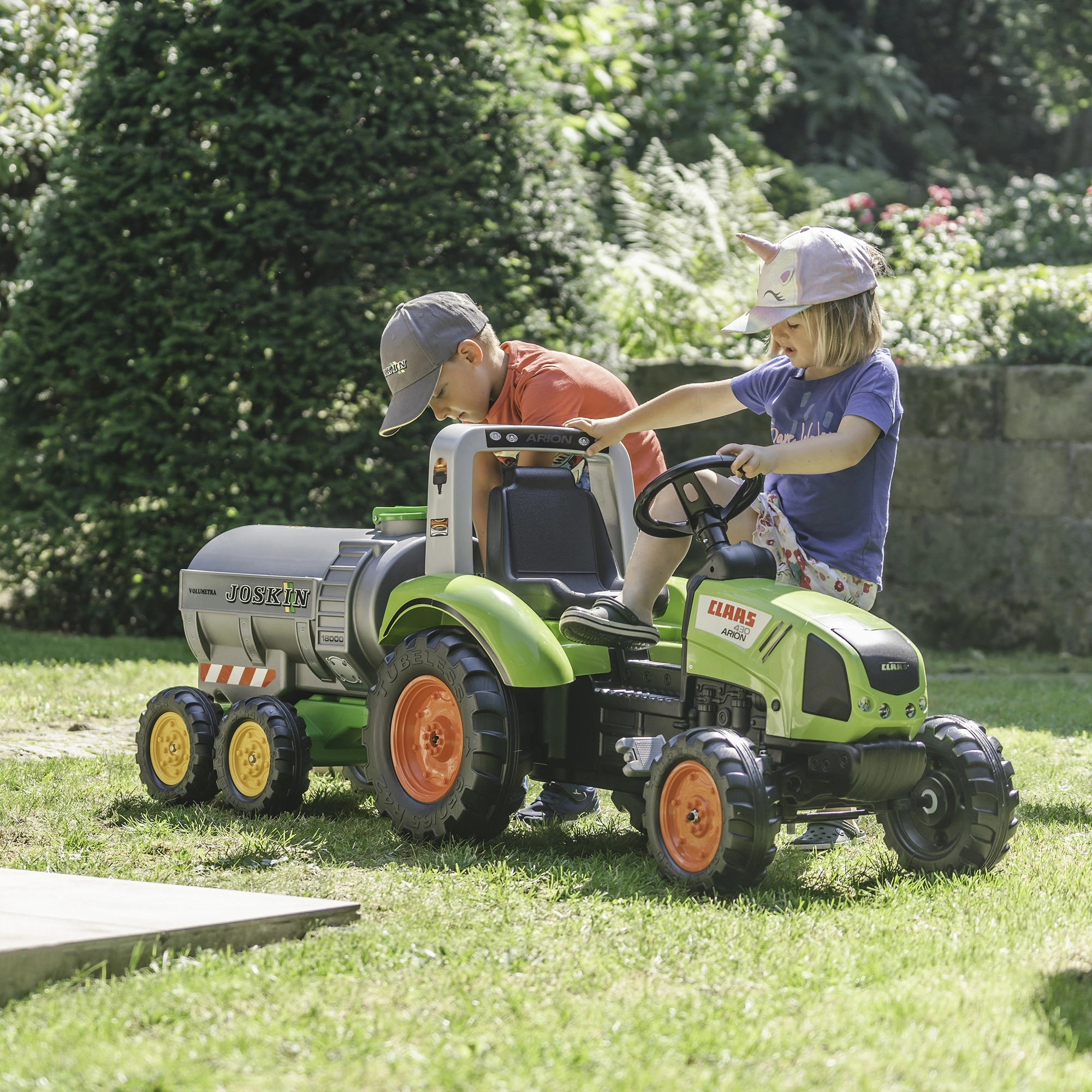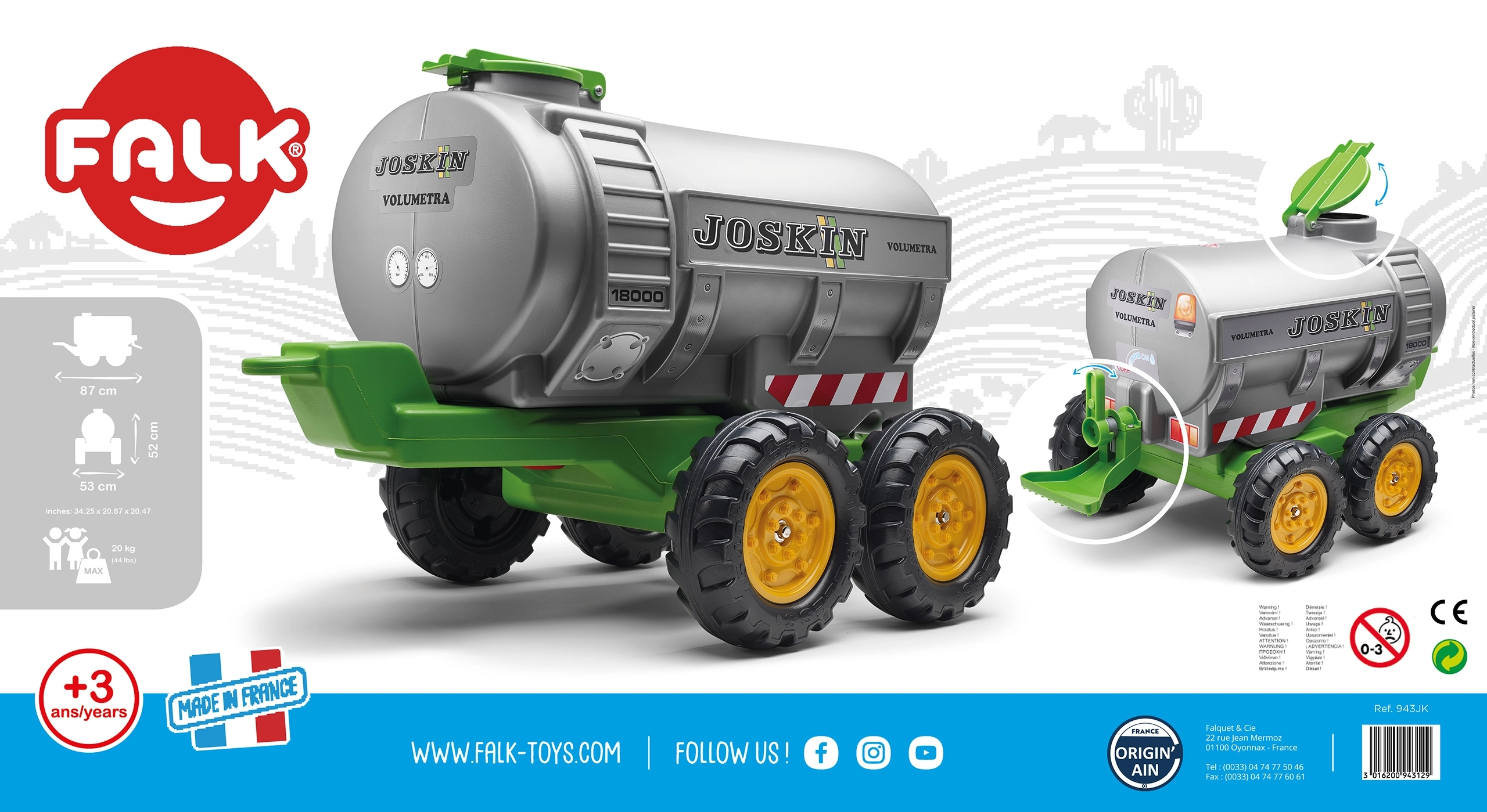 Ofrece a los niños una diversión agrícola realista con la cisterna remolcada JOSKIN de la marca Falk. Un gran depósito de agua de 30 litros, un grifo funcional y un aspersor convierten cualquier tractor infantil en una auténtica máquina de trabajo. Compatible con todos los tractores Falk para niños a partir de 3 años, fabricado en Francia con plástico de alta calidad.