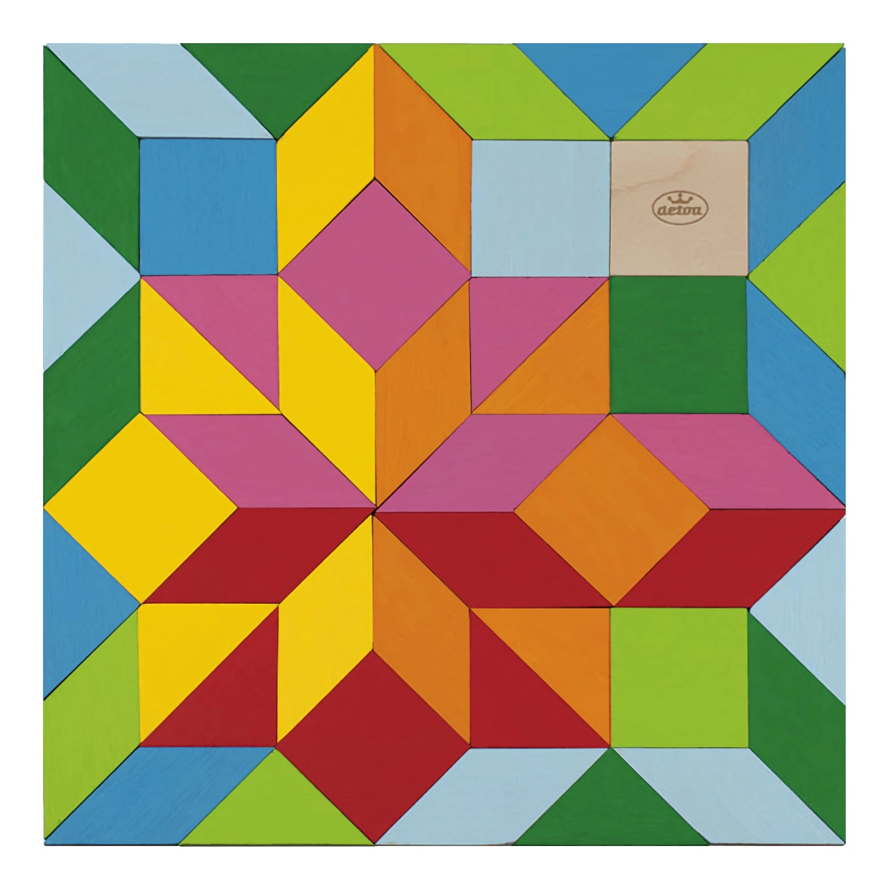 El mosaico Detoa es un clásico juego didáctico de madera resistente. Los niños colocan las piezas de colores en innumerables composiciones, practican la coordinación ojo–mano y descubren formas, colores y relaciones geométricas sencillas. El juego fomenta la concentración y la paciencia, y aporta la alegría de crear.