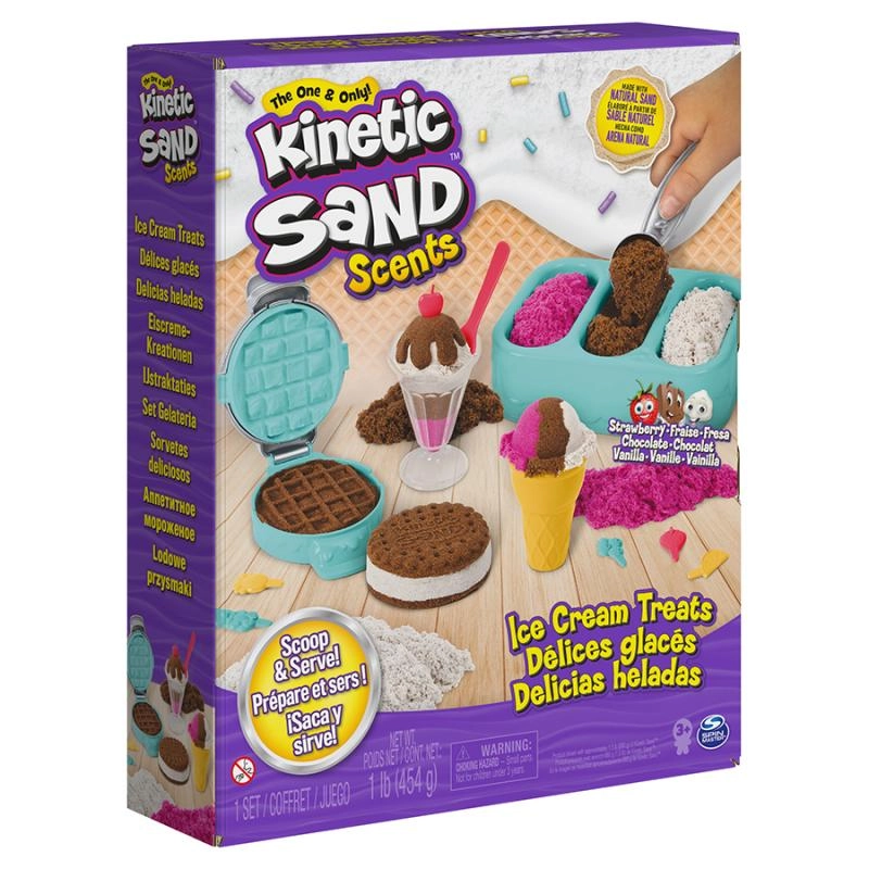 Sumérgete en el mundo de las dulces creaciones con el set Kinetic Sand Scents – delicias heladas. La arena perfumada de calidad sueca, gracias a su estructura única, se moldea con facilidad, no se pega a las manos y no se seca, para que los niños puedan jugar una y otra vez. Con la ayuda de moldes y herramientas, prepararán fácilmente bolas, sándwiches, copas y gofres.