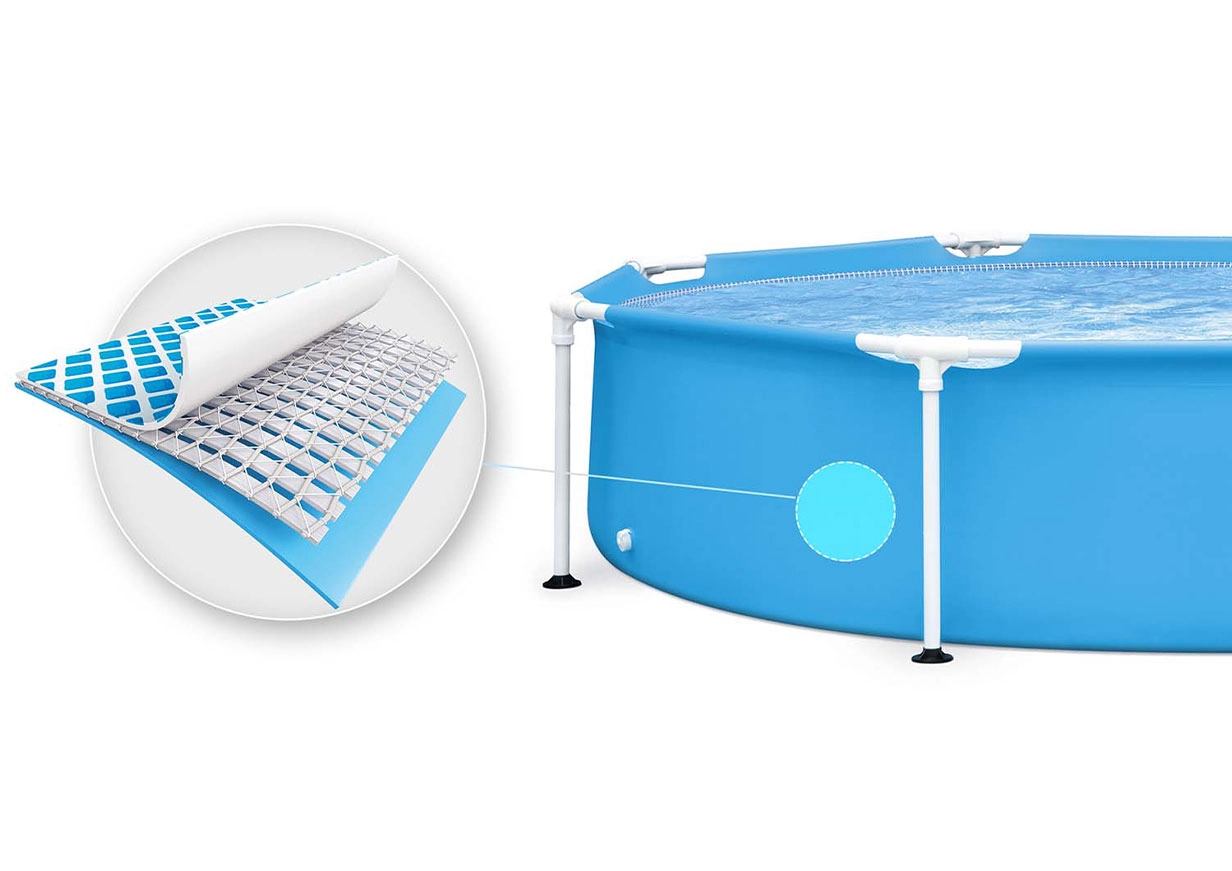 El refuerzo con malla de nailon en el centro de las paredes garantiza una larga vida útil y resistencia a los desgarros y a las condiciones climáticas. La práctica válvula de vaciado facilita el mantenimiento y la conexión de una bomba de filtración (no incluida) ayuda a mantener el agua limpia.