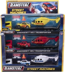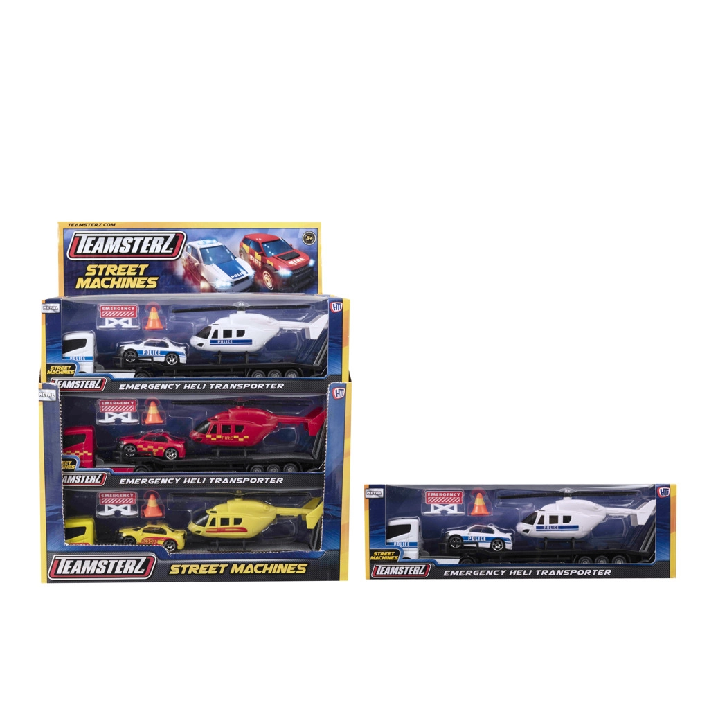 Te presentamos el transporte de coche y helicóptero Teamsterz, el set perfecto para pequeños entusiastas del tráfico y las misiones de rescate. Cada set incluye un camión que transporta un coche y un helicóptero. Disponible en tres variantes de color: rojo, amarillo y blanco.