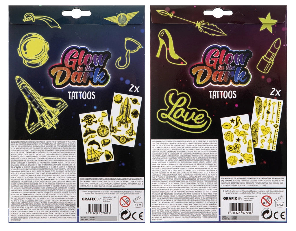 Este set de tatuajes luminosos es ideal para niñas que quieren añadir un toque de brillo a su estilo. Disfruta de los distintos motivos disponibles en el paquete, que incluye dos hojas de tatuajes. Simplemente recorta, coloca sobre la piel, humedece con una esponja y listo. Su uso es rápido y divertido.