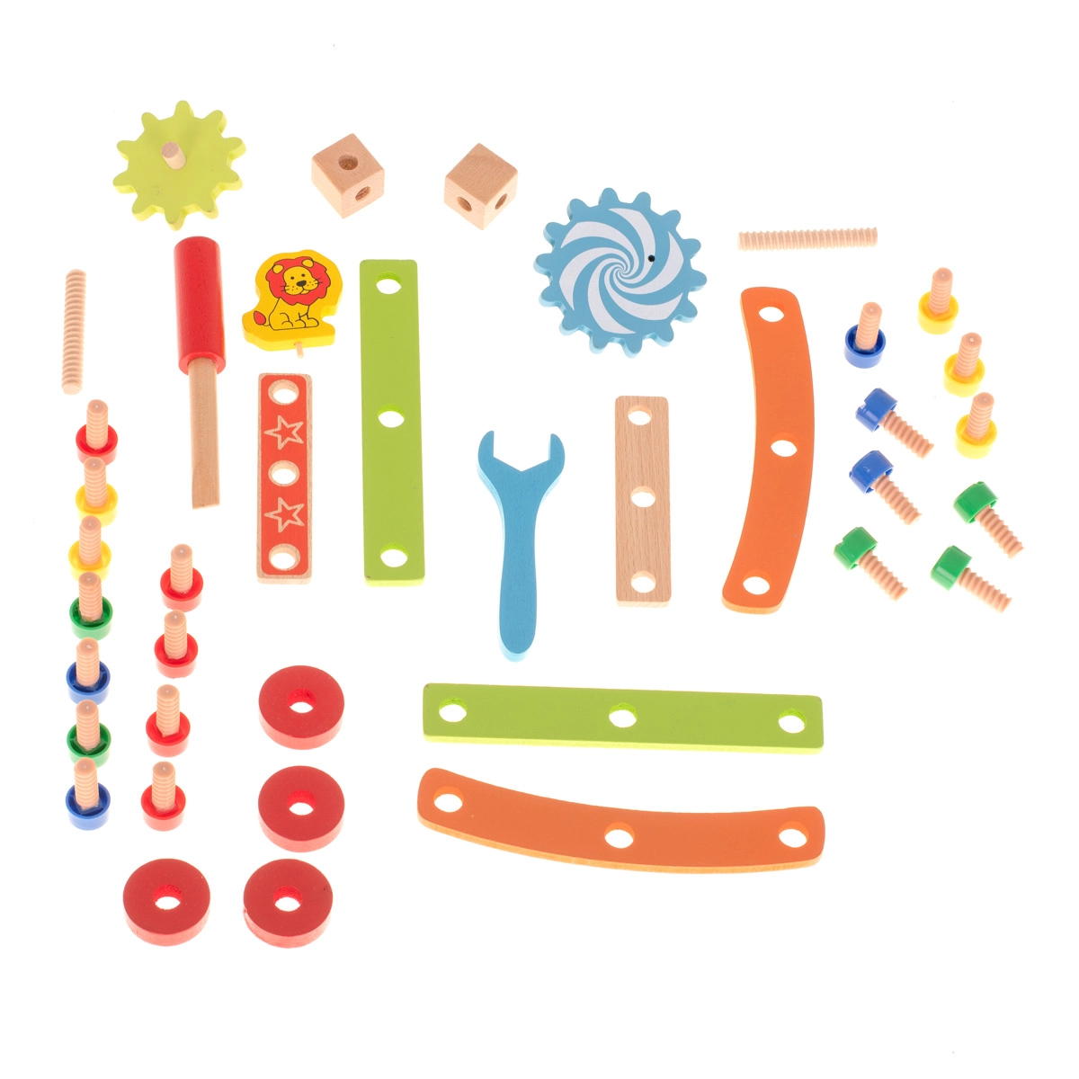 Incluye destornillador y llave de madera, por lo que los pequeños constructores tienen todo lo que necesitan. Las piezas multicolores con motivos divertidos (p. ej., leoncito y engranajes) fomentan el juego creativo y enseñan a reconocer los colores. Una gran idea de juguete educativo y regalo que entretiene durante horas.