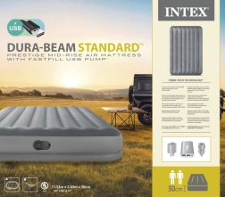 Disfruta de la comodidad en cualquier lugar: este colchón inflable doble INTEX es perfecto como cama temporal para invitados, para viajar o para acampar. El PVC resistente con una agradable superficie de terciopelo evita que la sábana se deslice y aumenta el confort. Gracias a su cuidada estructura interna, el colchón mantiene la forma, no se hunde y proporciona soporte estable para la columna.
