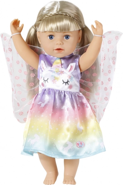 Convierte cada juego en una aventura de cuento. Este vestido para la muñeca BABY born de 43 cm (apto también para 39–46 cm) brilla con un degradado arcoíris, motivos de unicornios y delicadas alas. Gracias a los materiales de calidad, resiste muchas sesiones de cambio de ropa, fiestas de té y desfiles reales.