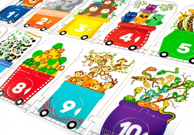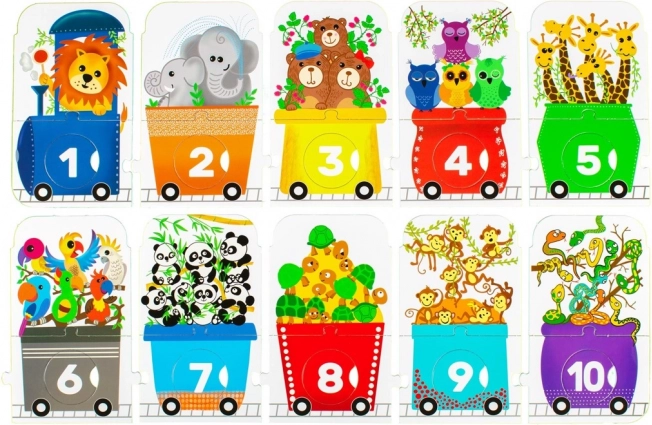 Este rompecabezas infantil con forma de tren ofrece un divertido desafío para los pequeños exploradores. Consta de una locomotora y nueve vagones, cada uno con un número diferente de animalitos: