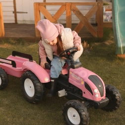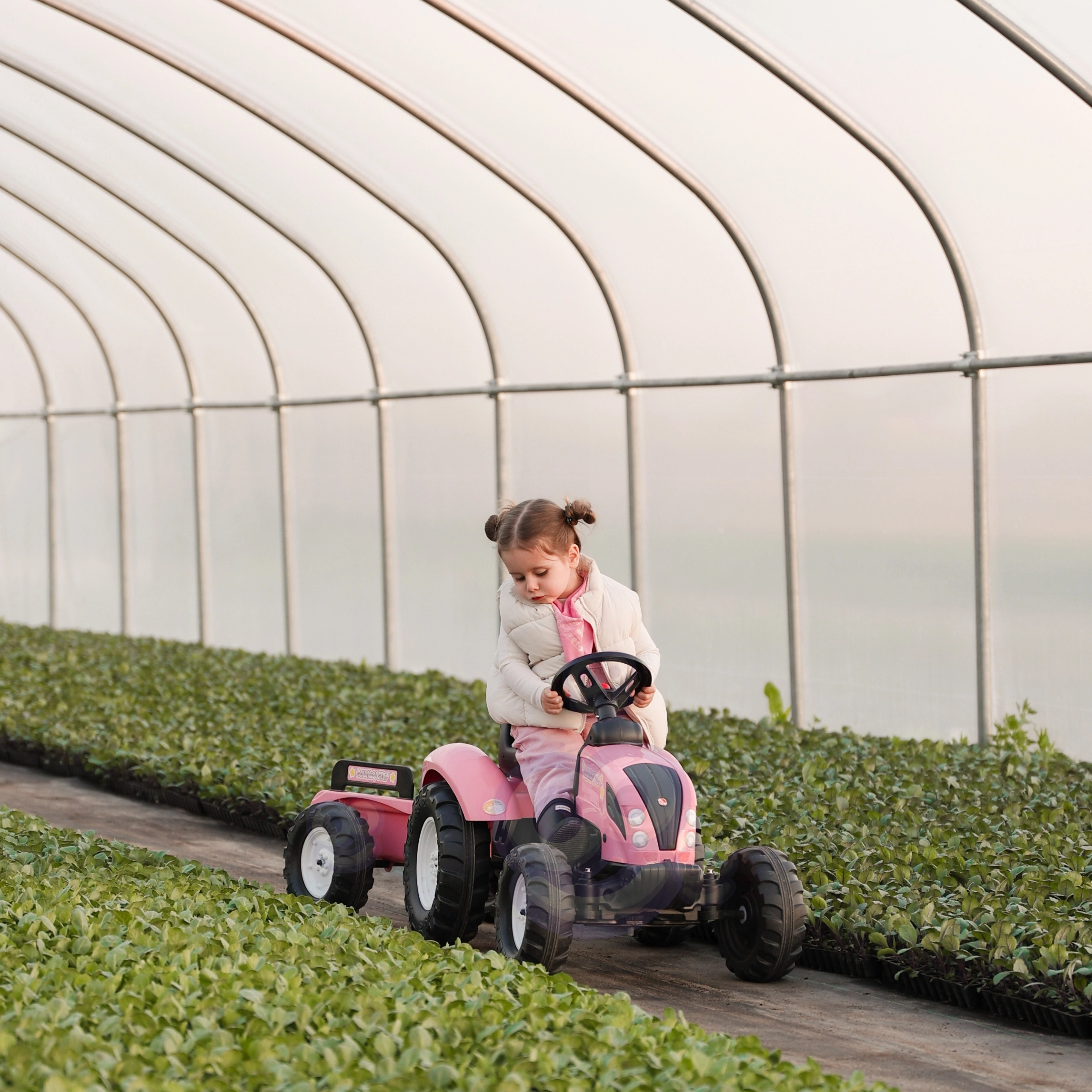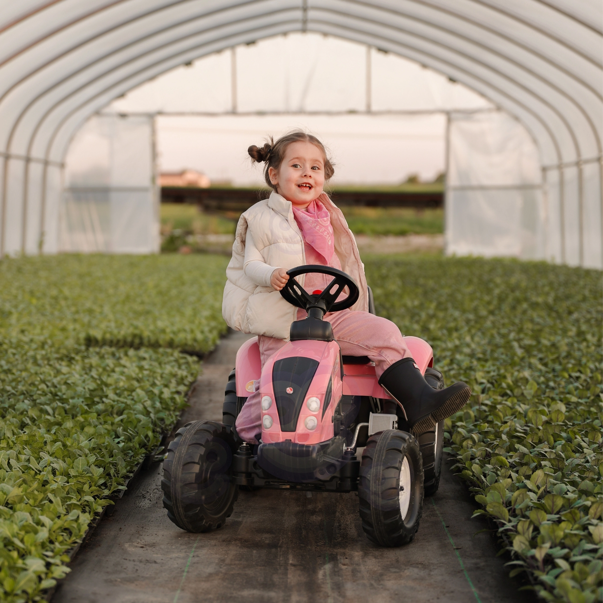 El tractor está diseñado para niños a partir de 2 años, cuenta con estructura estable, eje delantero giratorio para facilitar la dirección y claxon en el volante para un juego interactivo. La fabricación se realiza en Francia, con especial atención a la calidad y seguridad de los materiales.