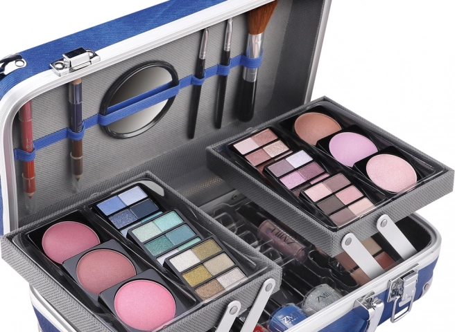 Maletín de viaje azul con esquinas metálicas, asa y cierres seguros que protegen la cosmética y permiten maquillarte en cualquier momento y lugar.