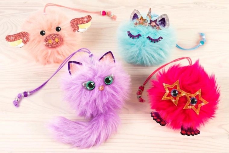 En el paquete encontrarás todo lo que necesitas: desde 4 bolas de felpa y una cola de felpa hasta cordones encerados y cinta autoadhesiva. Solo sigue las instrucciones incluidas y en un momento tendrás tus propios accesorios de moda.