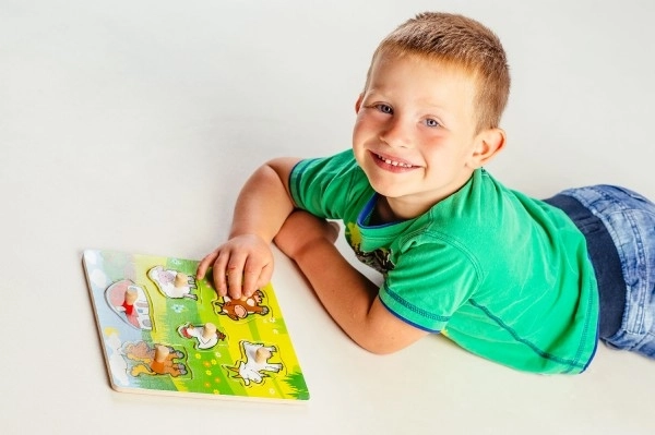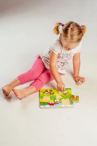Cada pieza del rompecabezas cuenta con una pequeña agarradera de madera, gracias a la cual los niños practican fácilmente el agarre y la colocación de las piezas en el lugar correcto.