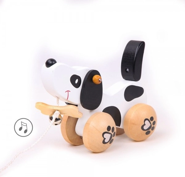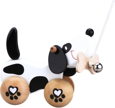 El perrito tiene ruedas con motivo de huellitas y su cola se mueve al avanzar, lo que aumenta su carácter lúdico. La diversión se potencia con la campanita, que estimula la percepción auditiva de los niños. Incorpora una cuerda unida a un hueso en la boca, lo que permite tirar de él fácilmente. El juguete es adecuado tanto para jugar en casa como al aire libre.