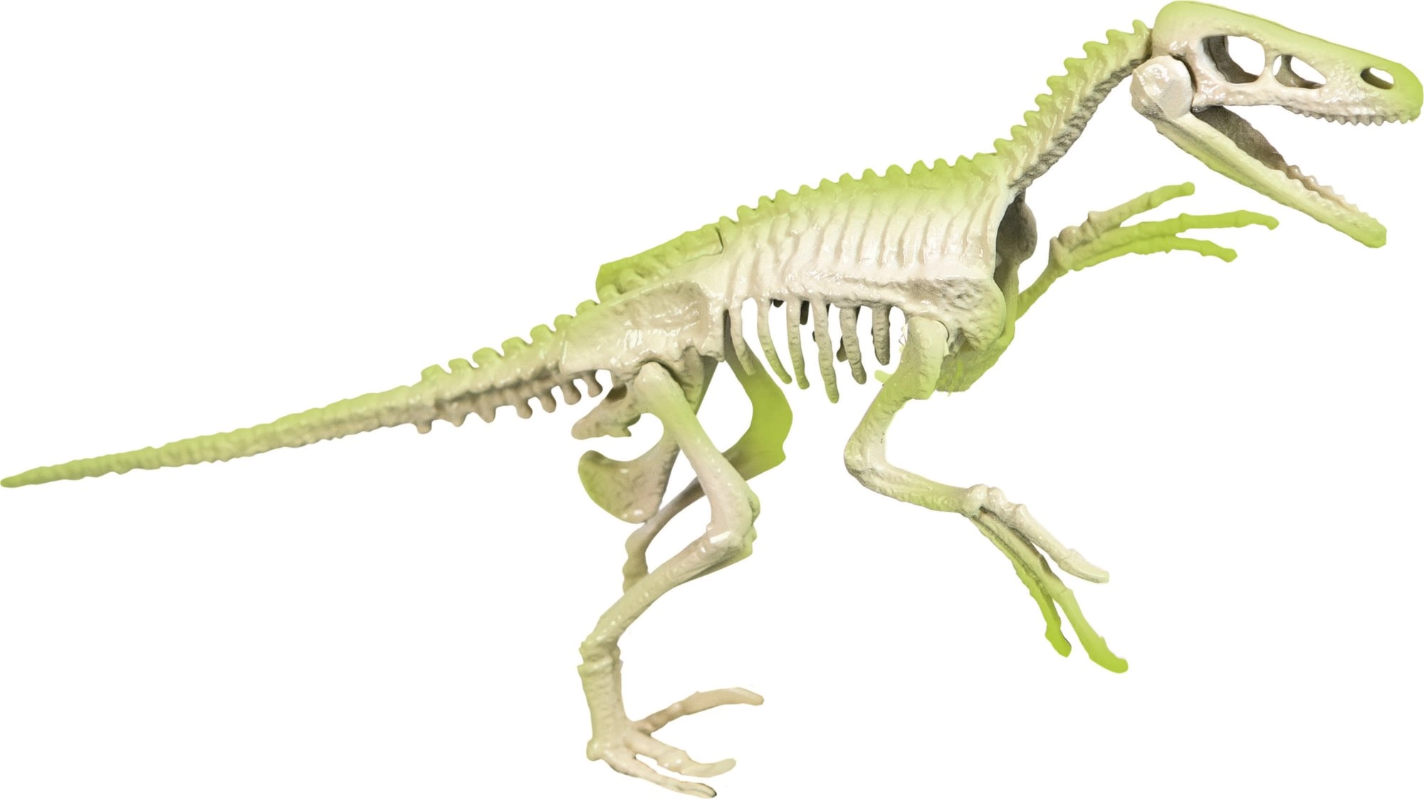El set arqueológico ArcheoFun ofrece a los niños una experiencia auténtica de excavación. Con martillo y cincel, irás desenterrando paso a paso la fósil oculta en un bloque de tierra y después, con las piezas encontradas, montarás un esqueleto realista de velocirráptor. Gracias al material fluorescente, el esqueleto absorbe la luz diurna y brilla en la oscuridad, lo que lo convierte en una excelente decoración para la habitación infantil.