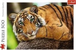 Rompecabezas con un fascinante retrato de un tigre compuesto por 500 piezas. Una vez armado, crea una imagen de 48 x 34 cm. Ideal para amantes de los animales y de los rompecabezas.