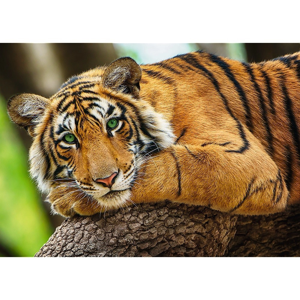 Este rompecabezas ofrece un retrato realista de un tigre que destaca por la intensidad de sus colores y sus delicados detalles. El papel calandrado con tintas ecológicas de base alimentaria garantiza una alta calidad y seguridad durante el montaje.