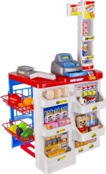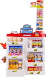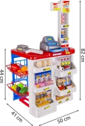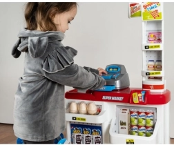 El supermercado infantil es ideal para pequeños vendedores y clientes. Incluye una caja registradora funcional con cajón extraíble, escáner de códigos de barras con sonido, báscula de tienda, estantes con productos y un carrito de compras. Gracias al completo equipamiento, los niños practican cálculo, comunicación y autonomía.