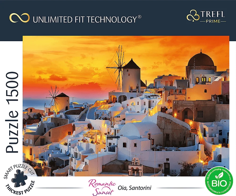Descubre el encanto de Oia, en Grecia, durante un romántico atardecer y llévate a casa un pedacito de atmósfera mediterránea. El sistema TREFL Unlimited Fit Technology (UFT) te permite conectar varios rompecabezas en un gran mosaico: tú defines los límites.