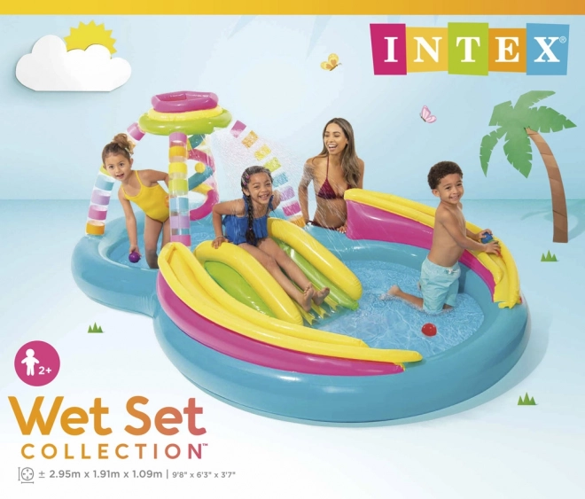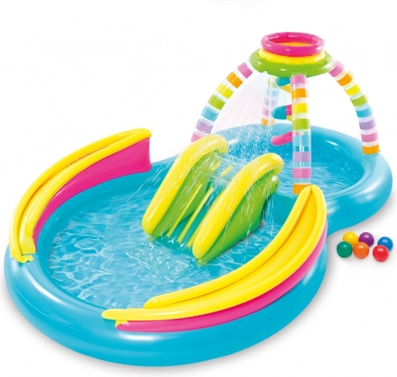 Este centro de juego con diseño arcoíris ofrece diversión y frescura en los calurosos días de verano. Incluye tobogán, ducha rociadora y un set de 6 pelotas para la mejor experiencia.